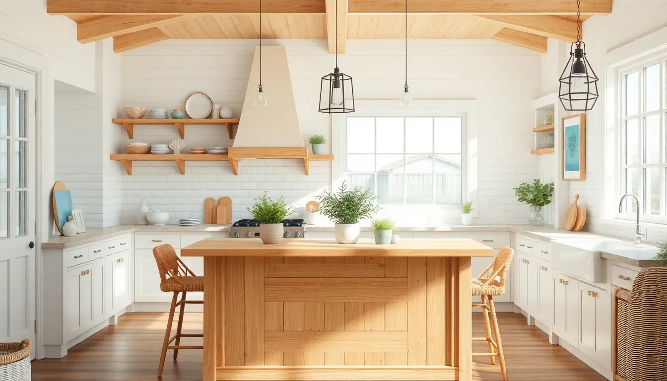 Soft colors dominate coastal kitchens. Shades of white, light blue, and sandy beige create a calming foundation. These colors mirror ocean hues, enhancing the tranquil vibe. Bright accents like coral or seafoam add playful touches while maintaining harmony. A consistent color scheme fosters a peaceful flow throughout the space, inviting relaxation and creativity.